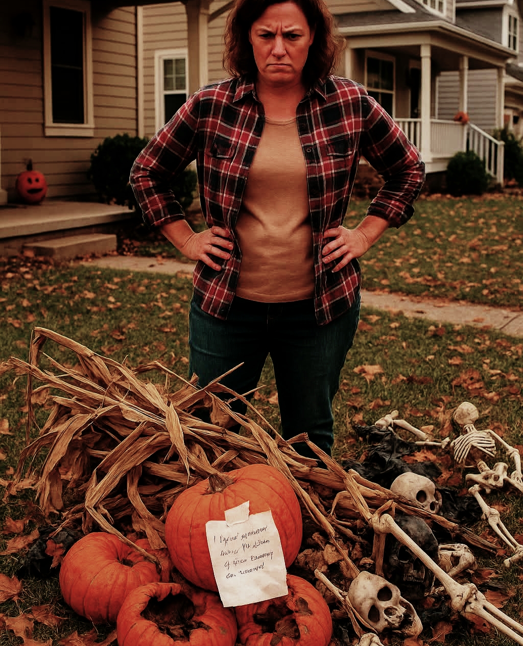 На следующее утро после Хэллоуина я шла на работу и была шокирована резким, противным запахом. За углом дома мое сердце екнуло: на газоне лежала гора гнилых тыкв, засохших кукурузных стеблей и разбитых скелетов. Сначала я подумала, что это какая-то шутка… пока не заметила записку, аккуратно приклеенную скотчем к одной из тыкв: