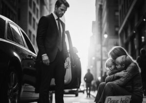 Переходя улицу на Мэдисон-авеню, он заметил что-то на противоположном углу — фигуру, прижавшуюся к стене здания. Женщина сидела прямо на холодном тротуаре, держа в руках кусок картона. Рядом, прижавшись к ней, стояли двое мальчиков — близнецы, не старше трёх лет. Их светлые волосы растрёпаны ветром, маленькие пальцы судорожно цеплялись за рукава её пальто. На картоне неровными буквами было написано: