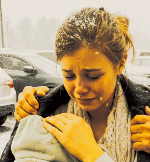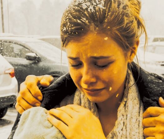 На парковке стояла молодая женщина, прижимая к себе ребёнка, завернутого всего лишь в тонкое полотенце. На ней был лёгкий свитер, совершенно не защищавший от холода. Она дрожала так сильно, что казалось, будто колени вот-вот поддадутся.