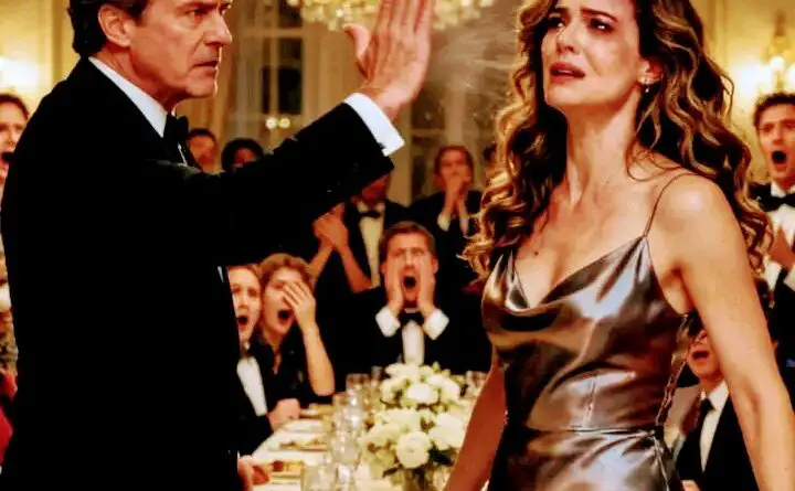 Щёка Елены горела. В глазах потемнело, но она не заплакала. Она выпрямилась, медленно подняла голову и посмотрела прямо на мужа. В этом взгляде не было ни страха, ни мольбы. Только холодное, ясное спокойствие. На секунду зал стих. Смех оборвался, будто кто-то выключил звук.