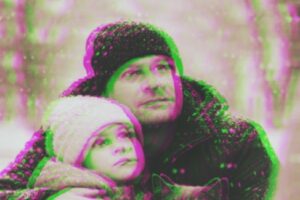 Мужчина крепко обнимал ребёнка, его руки были багровые от холода. Девочка пряталась в его груди, дрожа и сжимая ладошки. А кошка, ощущая чужую заботу, делилась последним теплом своего тела.
