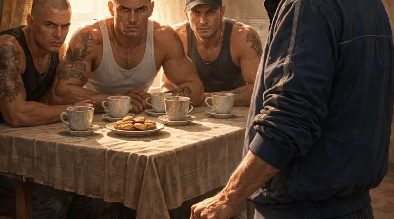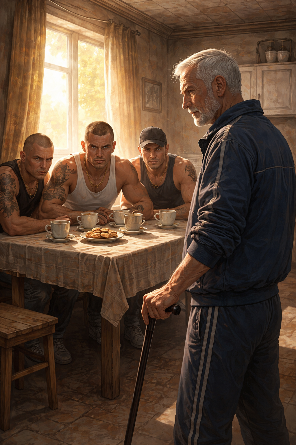 Молодые люди, привыкшие к страху и панике, вошли и разложились за столом, будто хозяева. Дед налил кипяток, поставил сахар и печенье, сел напротив и просто смотрел. Его спокойствие заставляло чувствовать себя неуверенно. Они не знали, кто перед ними — и это была их ошибка.