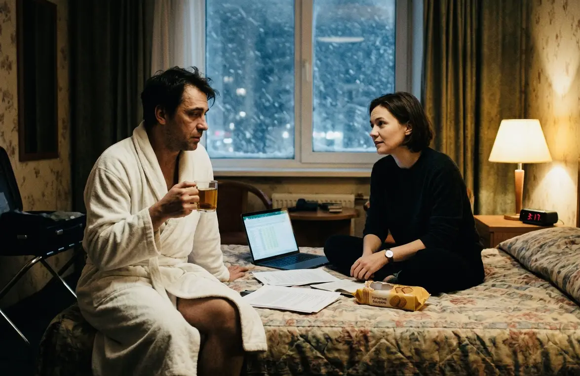 Когда из-за снежного бурана последний рейс был отменен, а в единственном открытом отеле города остался всего один свободный номер (классика жанра, не так ли?), ситуация из профессиональной превратилась в абсурдную. Именно здесь начинается наша история — в тесном пространстве, где статус «начальник-подчиненный» начинает медленно плавиться под давлением обстоятельств.
