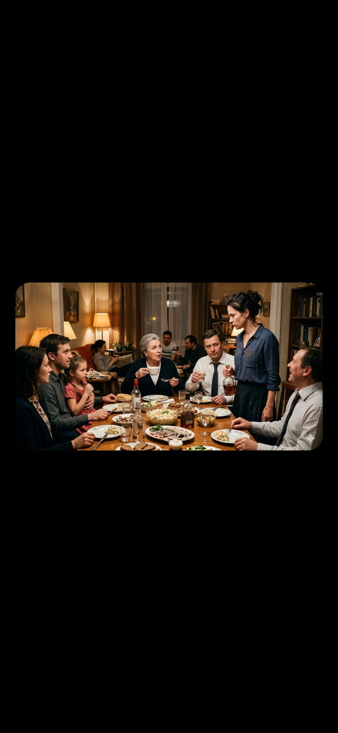 В комнате стало тихо. Марат, удивлённо подняв брови, посмотрел на жену. Гости, запутавшись в происходящем, лишь тихо переглядывались.