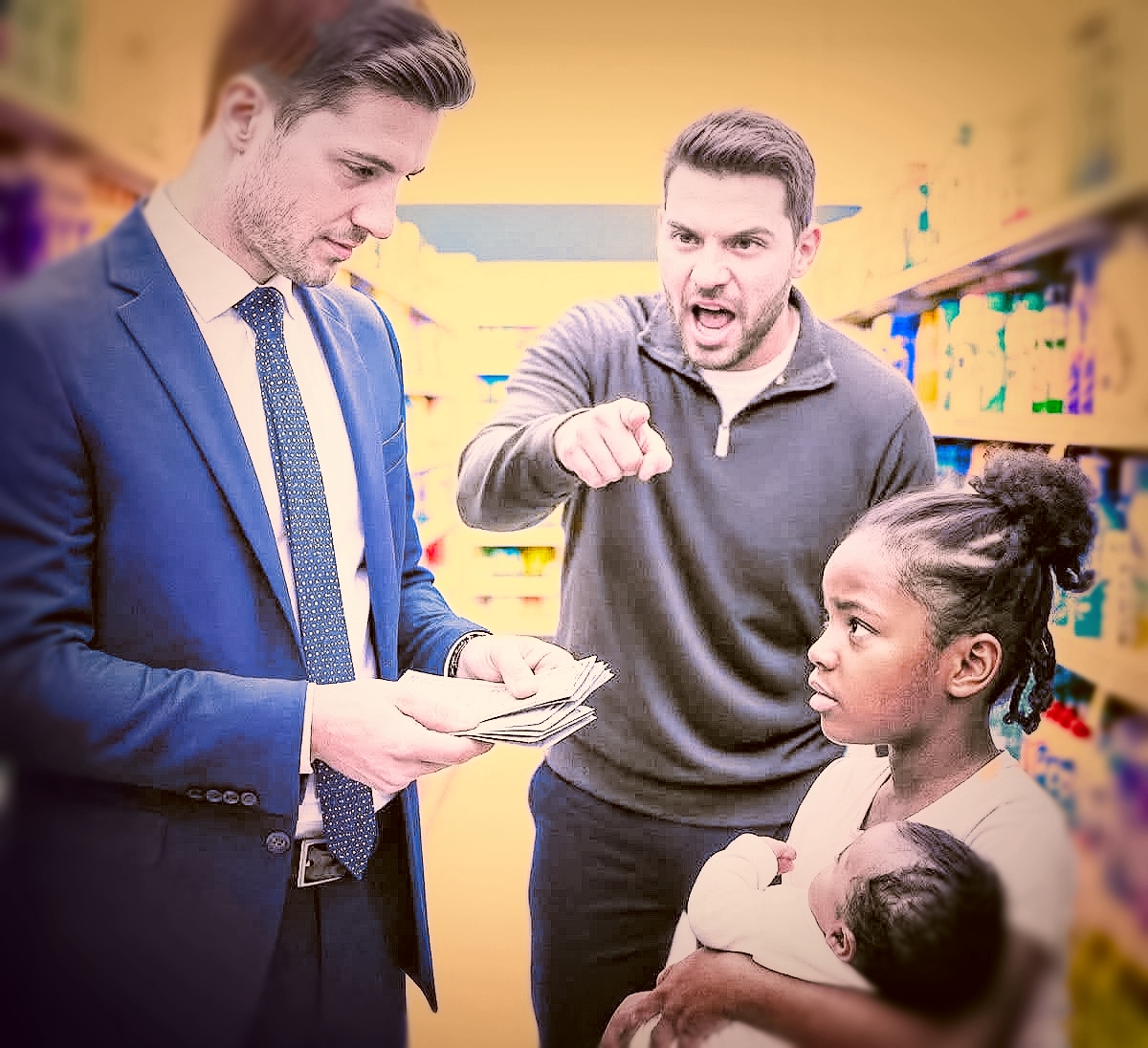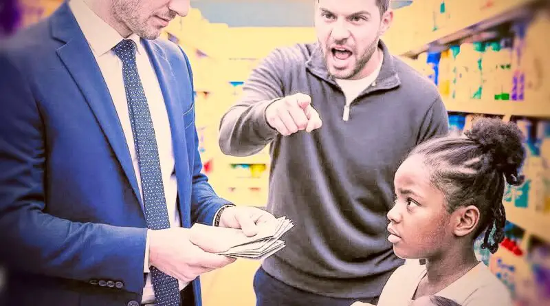 Магазин будто замер. Покупатели остановились на месте, корзины зависли в воздухе. Кассир нахмурилась, указывая на девочку пальцем с недоверием.