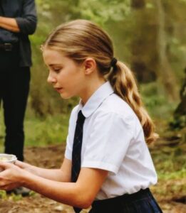 Она направлялась к небольшому леску за школой. Её фиолетовый рюкзак подпрыгивал за спиной, а походка была удивительно уверенной для такой маленькой девочки — словно она точно знала, куда идёт и зачем.