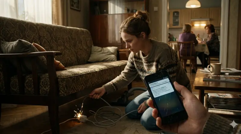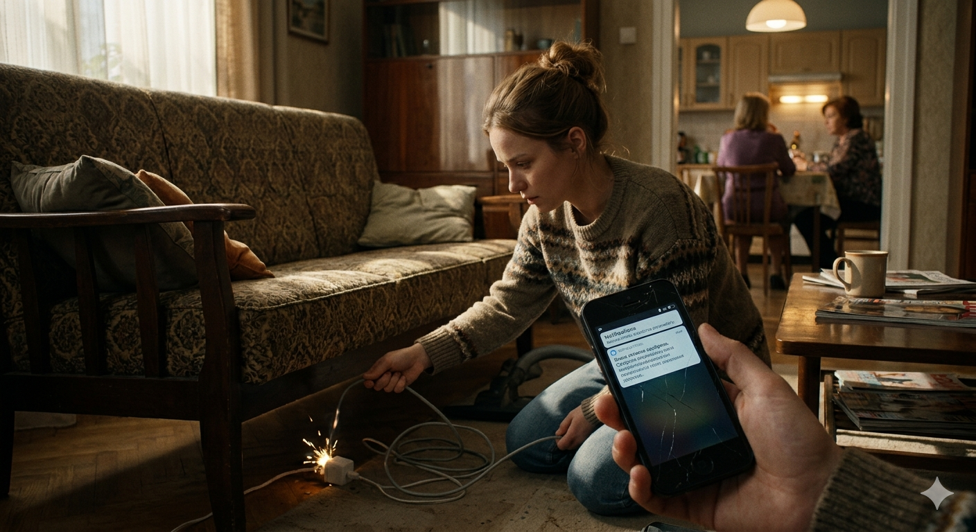 Зарядник искрил, когда София пыталась вытащить провод пылесоса из-под тяжёлого дивана. В тот момент её рука нащупала чужой блок питания. Подключённый к нему старый смартфон оказался ей знаком — это был её прежний телефон с треснутым экраном, давно убранный в ящик.