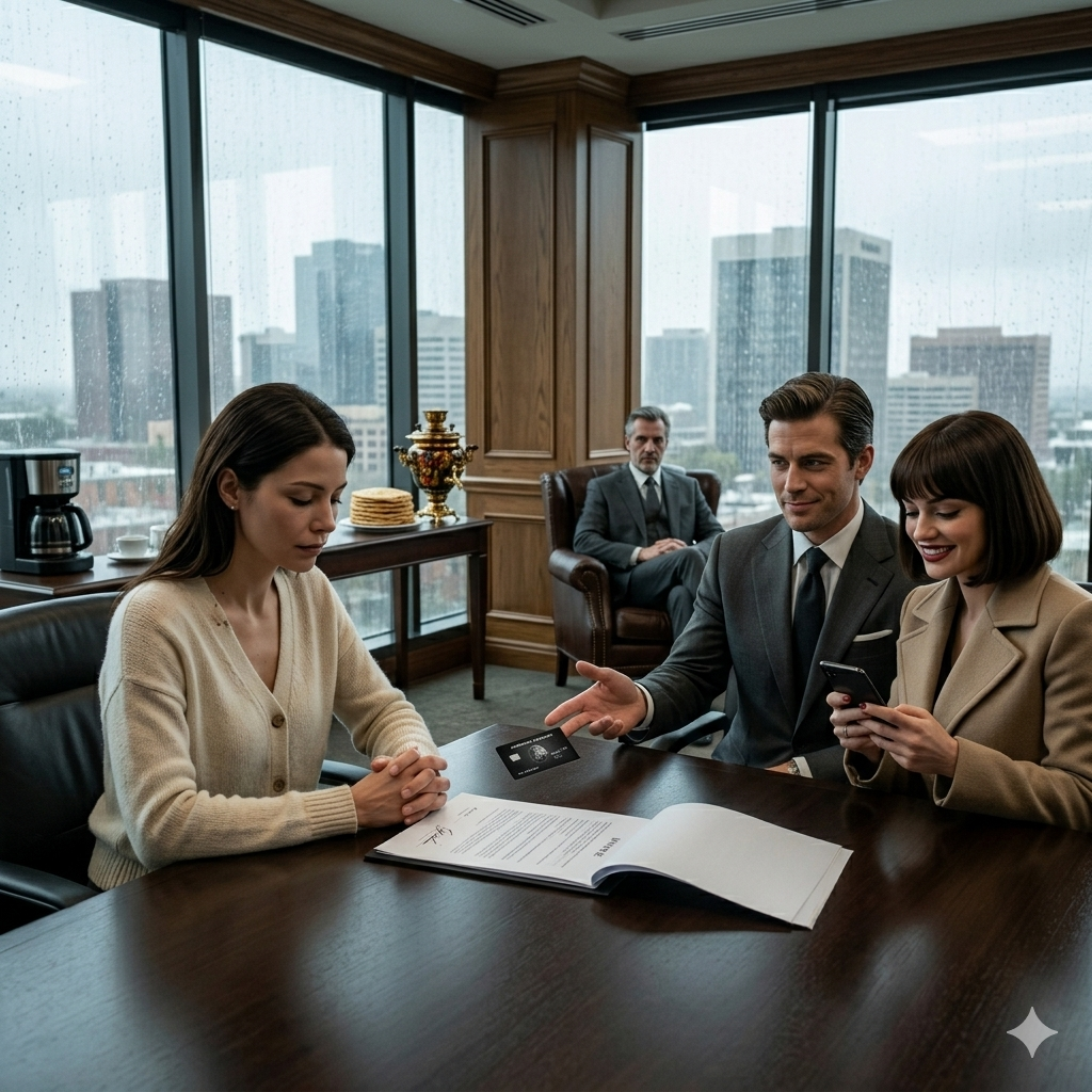Переговорная комната юридической фирмы была наполнена привычной атмосферой завершения: запах кофе, приглушённый свет и тяжёлая мебель создавали ощущение окончательности.