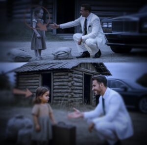 Он огляделся, потом медленно подошёл к хижине, осторожно, будто боялся спугнуть что-то хрупкое. Когда он увидел девочку, его лицо изменилось. Он опустился на колени, а его дорогие брюки тут же испачкались землёй. Мужчина протянул руку, открыв ладонь.