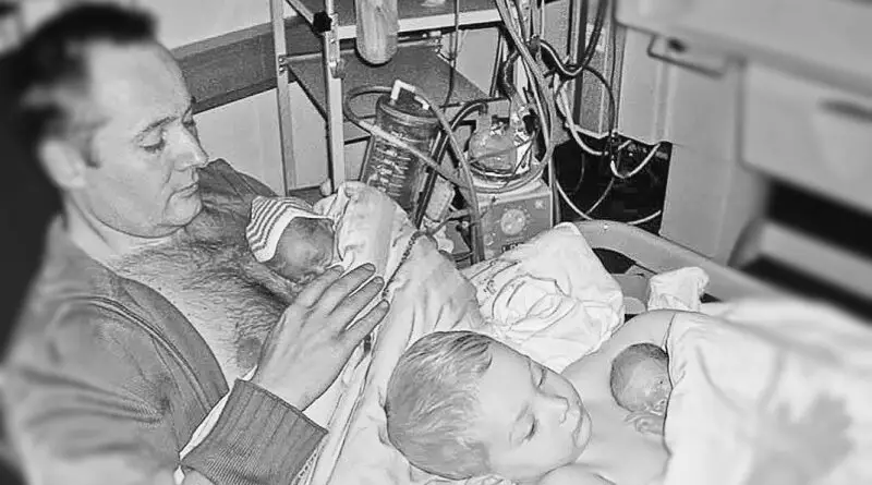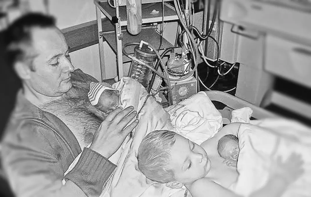 Отец и старший сын лежат рядом, плечо к плечу, каждый прижимает к своей обнажённой груди одного из недоношенных близнецов. Малыши ещё слишком слабы, чтобы удерживать собственное тепло, им нужна помощь — и именно поэтому врачи решили использовать метод «кенгуру». Тепло тела папы и старшего брата становится для крошек живой заменой инкубатора.