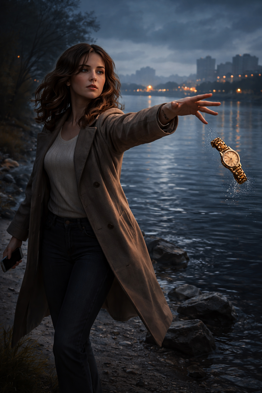 Поздно ночью Анна стояла у берега реки. Городские огни отражались в воде, создавая дрожащие полосы света.